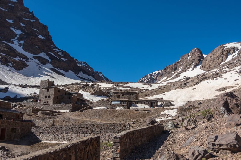You will be picked up from your accommodation in Marrakech at 9.00am. Your driver will take you to the starting point of your trek at Imlil (1740m) where you will meet your guide and muleteer (about 1 ½ hours drive). Imlil is a large picturesque village set at the head of the Imlil Valley surrounded by walnut groves, apple trees and bisected by a rushing river. Once you have loaded up the mules, you will head off on your trek. Your first day is moderately challenging with a steady ascent up the Mizane Valley towards Mount Toubkal. On route, you'll pass the shrine of Sidi Chamarouch. Then it’s onwards and upwards to the Toubkal Refuge – your stop for the night. Overall, you’ll have walked for four to five hours.